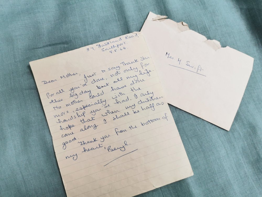 I am the type of person who looks a lot deeper into the work that I do coming from a Documentary Degree background. I have always looked beyond and in some circumstances when you are sorting through donations I find you can get a real sense of a person. One particular occasion springs to mind is when I opened a donation which contained a Cancer Patient Record which showed a list of appointments and books on finding hope, searching for answers and seeking god in their path it was heart breaking to say the least. I think it is important to remember in retail we can become less sensitive to our core functions but always remember each item was treasured and loved at one time. I am currently collecting items that signify as a personal treasure from donations we receive and those that are found by others and I wanted to share with you one letter that I have found tucked safely inside a handbag which must have been the donors favourite as such a special letter would never have been far out of her reach. So well loved and now lost forever to the people that it meant so much to has now travelled all the way into my hands in Cardiff from Stockport in 1964 and was written on the eve of her Daughter’s Wedding day…